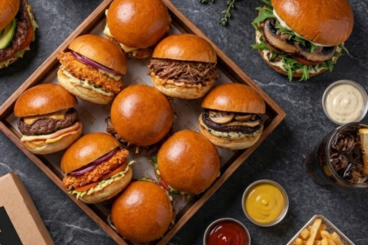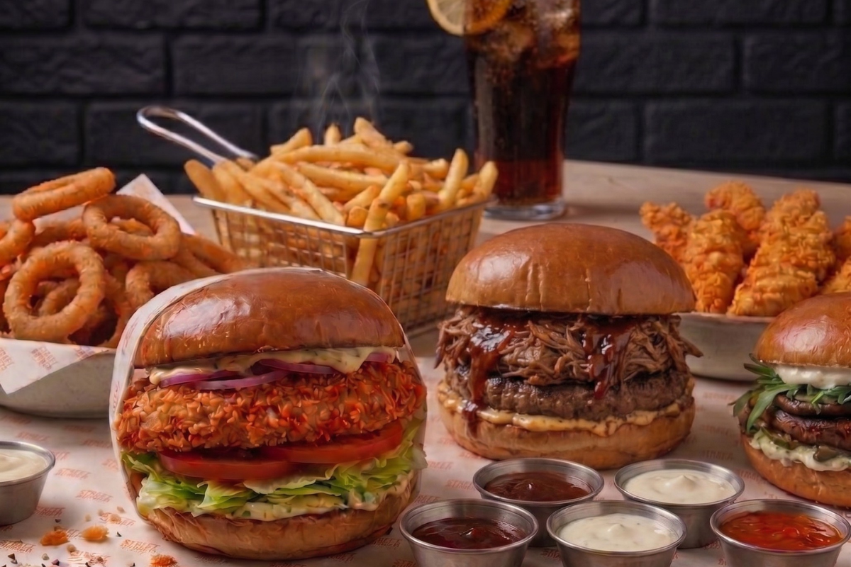 3 המבורגרים עסיסים, 5 תוספות לבחירה, שתייה ורטבים
