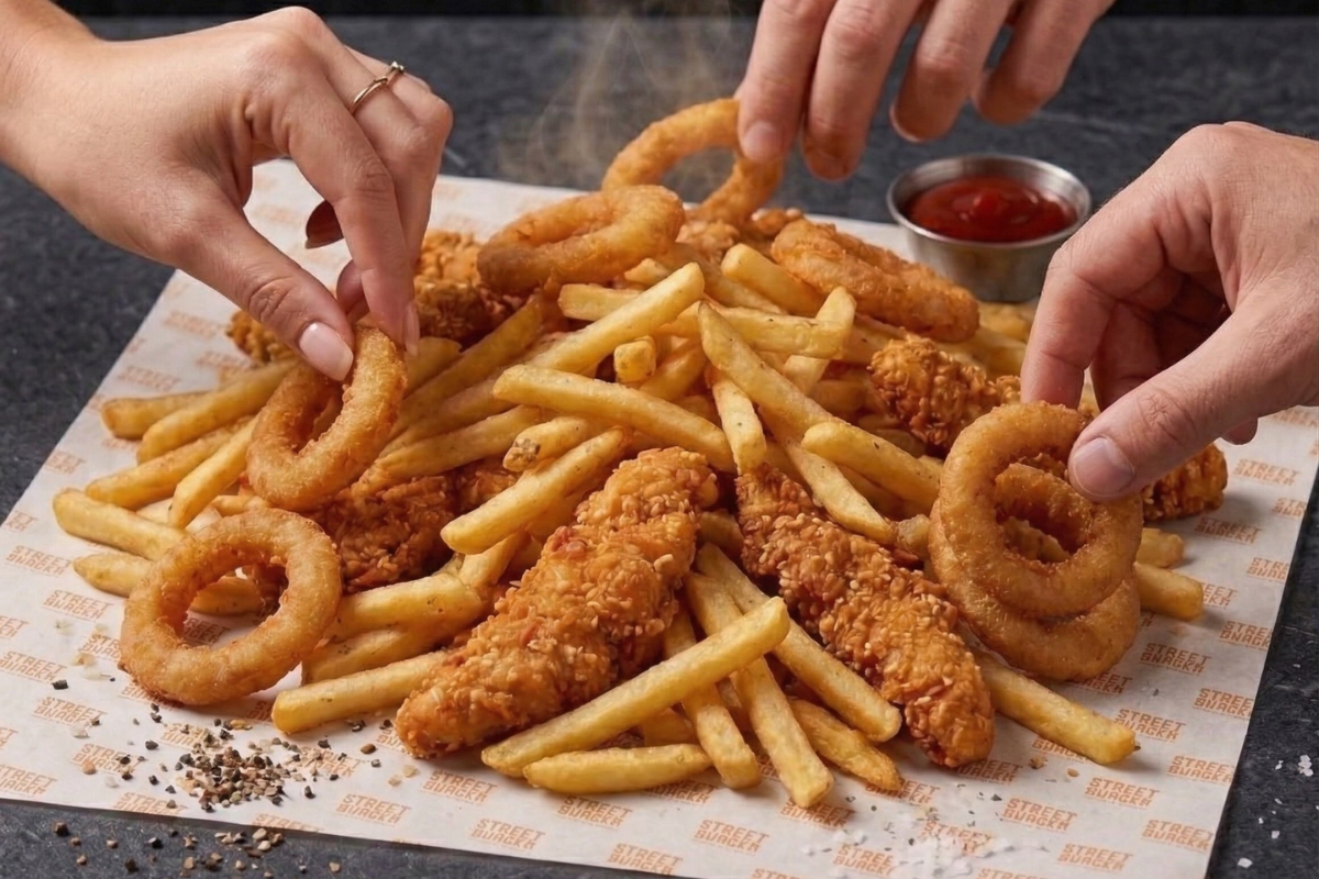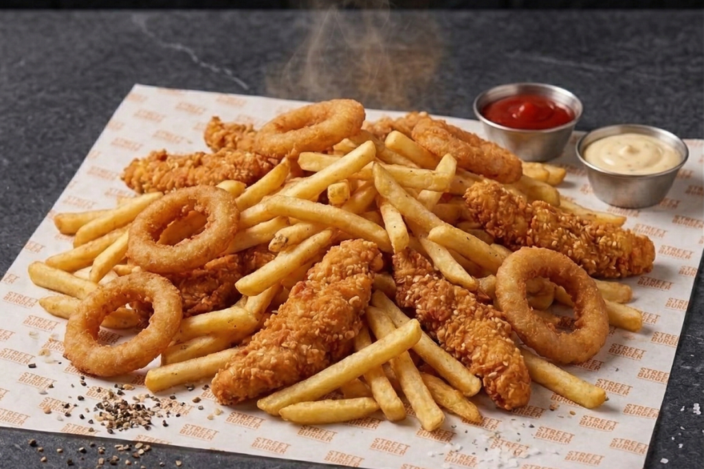 מיקס תוספות של שניצלונים, ציפס וטבעות בצל לצד רטבי הבית