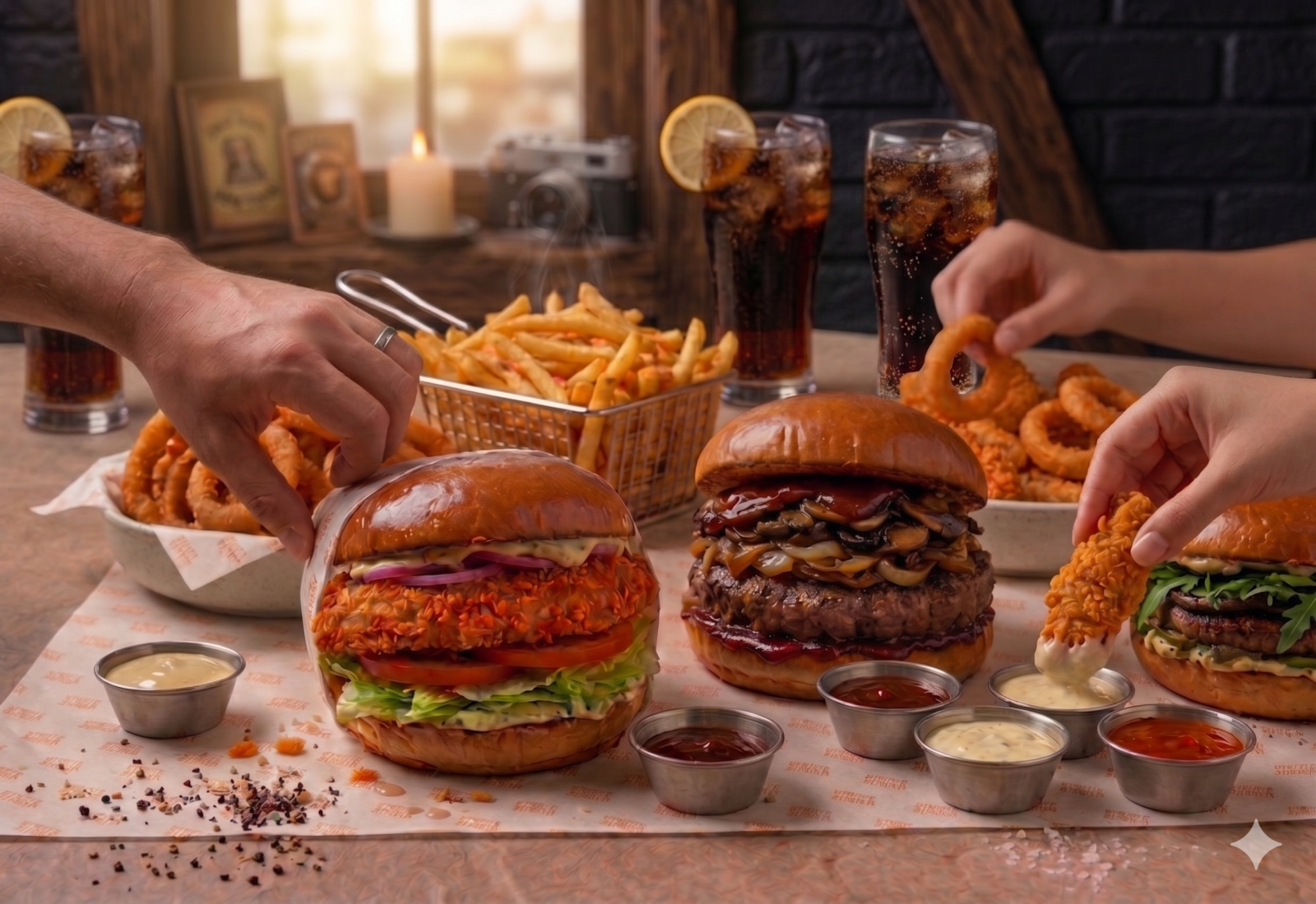 המבורגר עסיסי, תוספת לבחירה, שתייה ורטבים